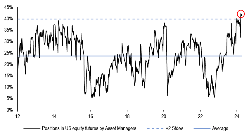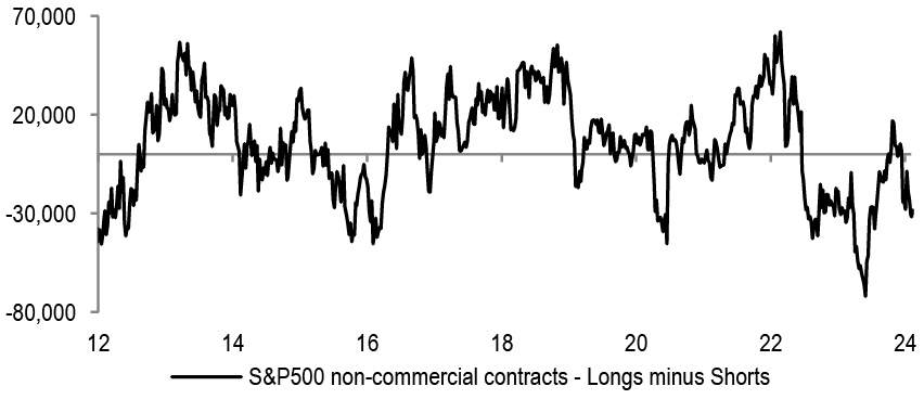 We do not think that P/Es can drive further equity upside without the support of earnings upgrades. Investors are expecting S&P500 EPS to accelerate by almost 20% by Q4 compared to the projected Q1 ‘24 levels. That hurdle rate is too steep in our opinion.