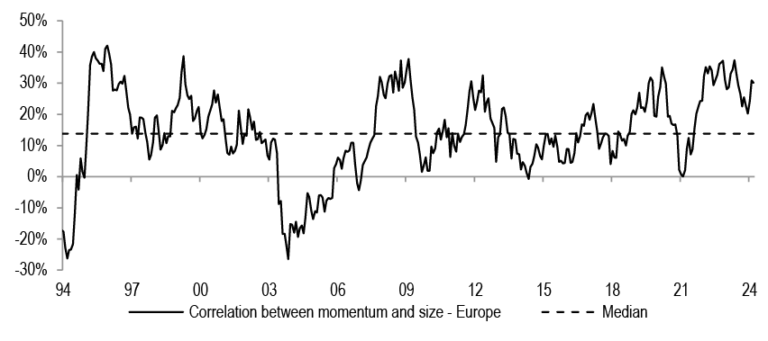 The correlation between momentum and size factors is at elevated levels, suggesting that stocks with bigger index weights are driving the momentum rally.