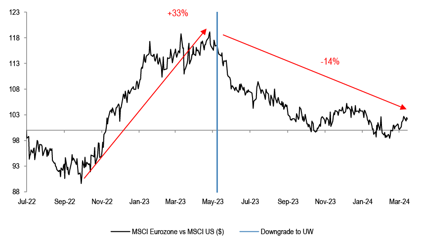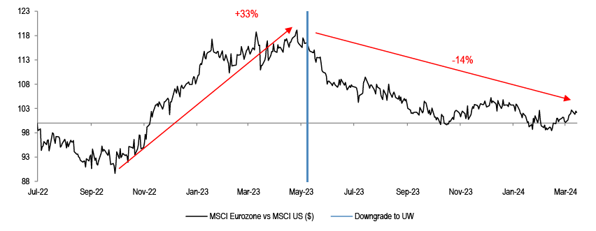 We held an upbeat view on Eurozone equities since Q4 ‘22, before downgrading the region to outright Underweight in our regional portfolio in May of last year. Our bullish view on Eurozone at the time was driven by the call that gas prices were set to fall, by China reopening, and by what was the extremely cautious positioning on the region at the end of 2022. We downgraded Eurozone in May ‘23, on the back of the view that activity momentum was set to weaken, with Eurozone equities underperforming US by 14% in dollar terms since.