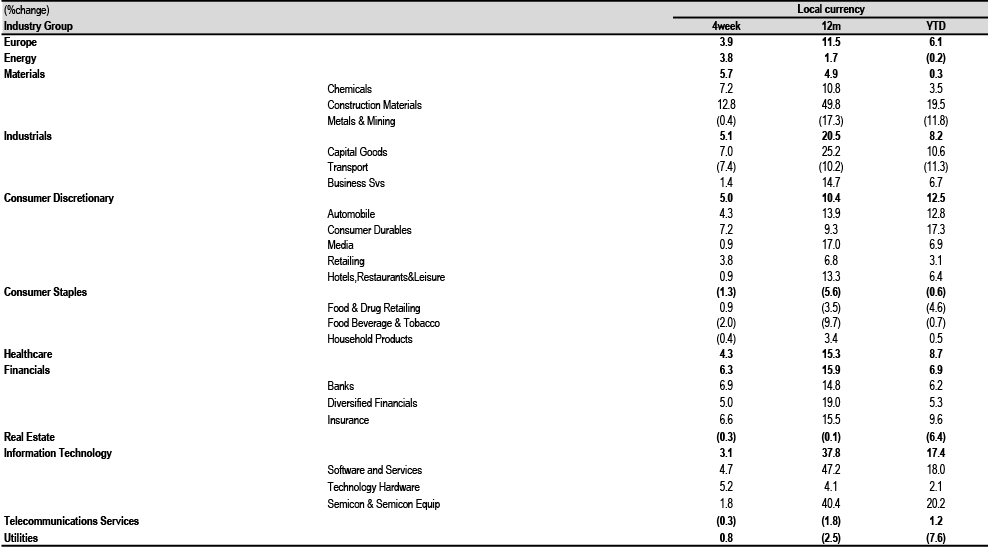 Eurozone is more leveraged to China than is the US, and this has contributed to Eurozone’s weaker showing relative to the US. China could trade better in the near term given its nearly 40% underperformance and very light positioning. Our China strategists have a constructive view on the market. The key arguments they highlight in favour of China equities are the budget deficit having surprised to the upside, the Rmb 1trn special CGB scheme, and the lifting of the debt ceiling program.