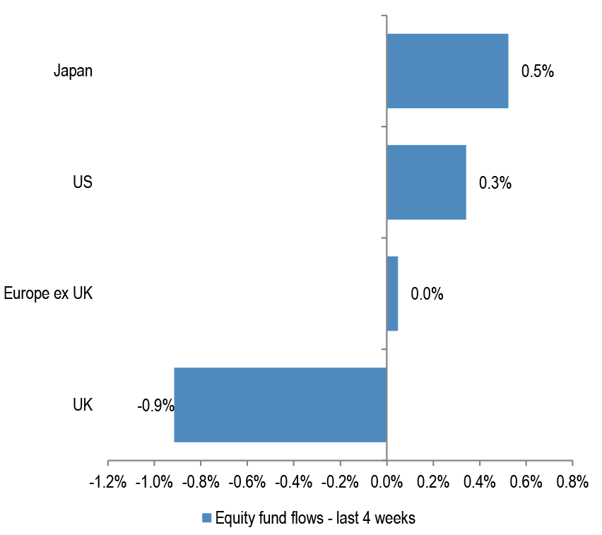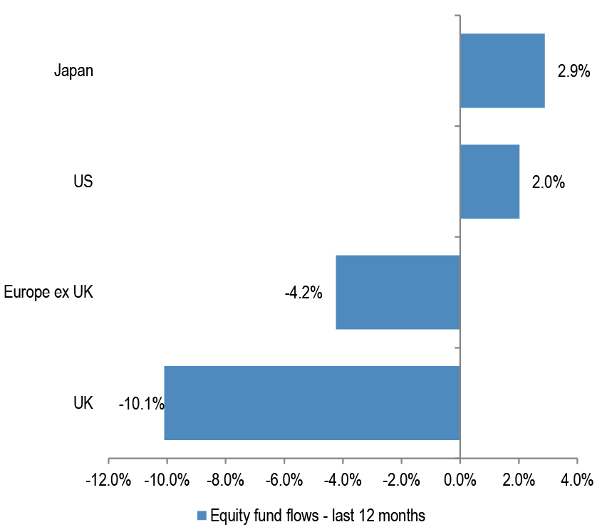 Apart from the renewed underperformance in the past few quarters, Eurozone equities have seen meaningful outflows, which contrasts to the US inflows.
