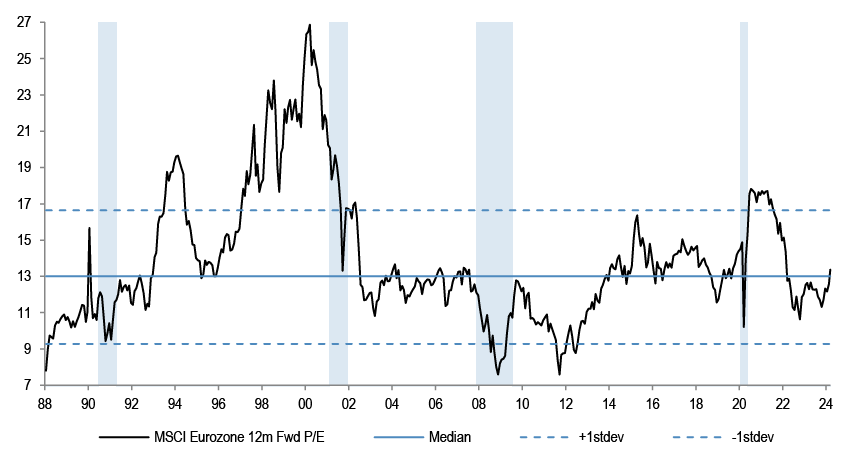In absolute terms, Eurozone 12m Fwd P/E at 13.3x is broadly in line with its long-term history.