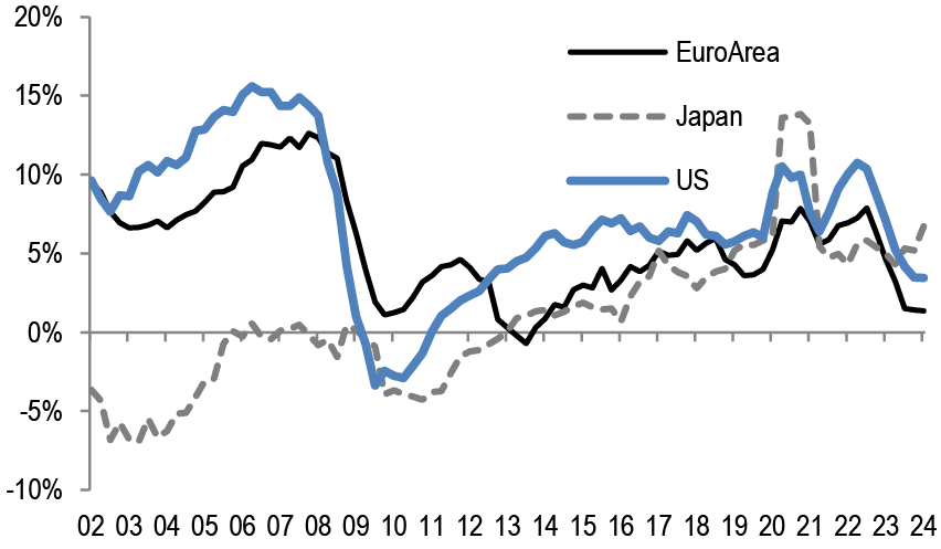 • In all, ahead of this week’s US labor market report, market pricing appears to suggest little US recession risk priced in equities and credit, while bond and commodity markets seem to price in more elevated recession risk. In terms of positioning, we see elevated positioning in equities whether we look at global non-bank investors at the aggregate level or at the investor level, with the exception of momentum-based investors who appear to have more modest longs in the US but are closer to neutral in other regions. Bond positioning does appear somewhat long overall, whether we look at overall non-bank investors or at the institutional investor level. Given that market pricing already looks for Fed funds rates at around 3% by end-2025, which could broadly be characterised as ‘neutral’, long duration positions from here arguably imply more elevated recession risks as rates would need to decline by more than forwards. Depressed commodity positioning is also consistent with higher recession risk.