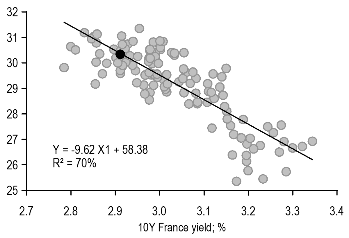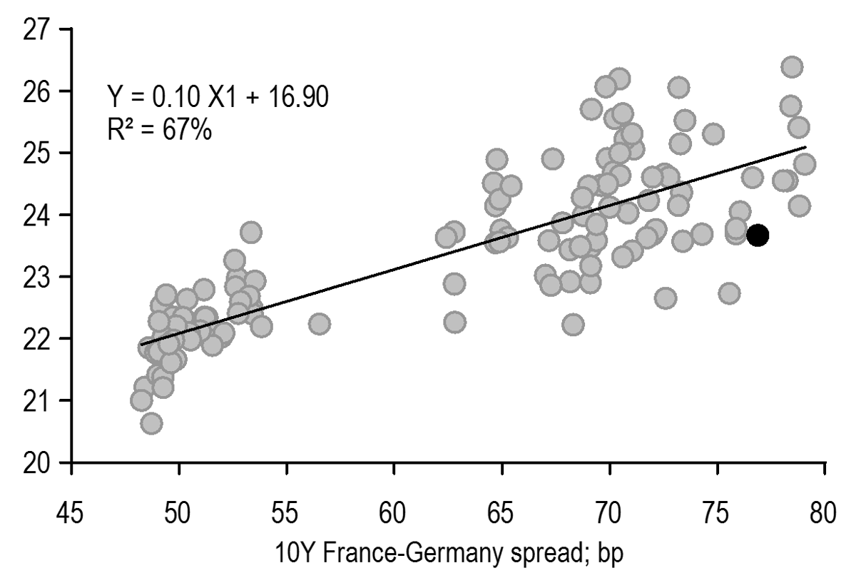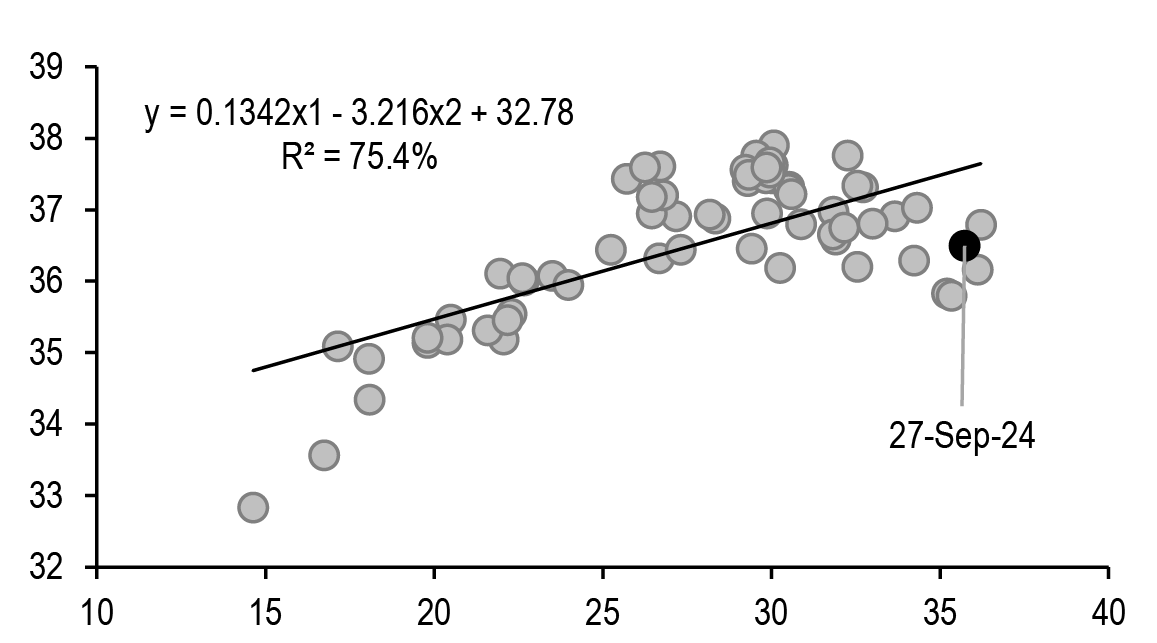 Euro area data was particularly in focus, given the release of the September PMIs, the consumer confidence readings, inflation data in France and Spain and the German employment report over the past week. The September PMIs delivered a disappointment, with the strongest weakness showing up in France and Germany; the German IFO also printed below expectations further reinforcing the PMI disappointment. While the weakness in the French survey could be rationalized as an Olympics-related retracement, the more acute miss in Germany (and the modest softening also in other countries) raises doubts over the growth outlook. Of particular concern was the weakness registered in the PMI employment index in Germany, which was further confirmed by the downside surprise in the unemployment data released later in the week. Indeed, while German production had been depressed for a while and services had been slowing down, the recent data indicate that this is now accompanied also by a softening in the labour market. Despite consumer confidence still being quite strong, we now believe that risks to growth are tilting. As discussed in Both sides now:Widening global growth tails, B. Kasman, 26 September, we continue to see around 35% probability of recession globally over the coming months, but the recent data indicate that the tail risks around our forecast are widening, being the lowest in the US but the highest in the Euro area. On the inflation side, CPI Spain and France considerably missed expectations, with energy prices being the major driver of the decline in both countries even though also core inflation dropped below expectations in Spain and services disinflation was noted in the French press release. We still have to see the inflation numbers for the rest of the Euro area, but we believe that the Spanish and French prints already suggest a higher conviction in the broad disinflation process in the Euro area.