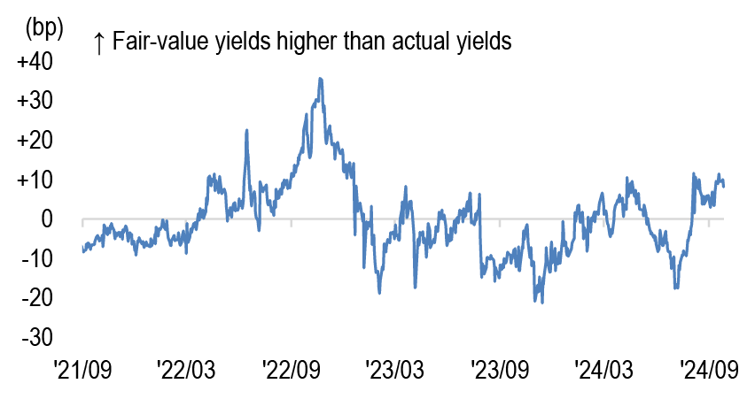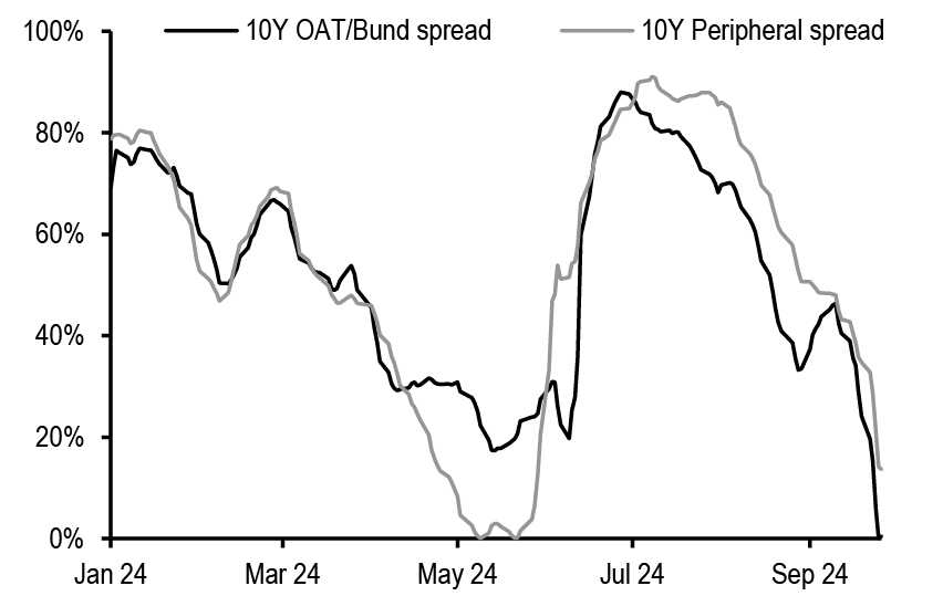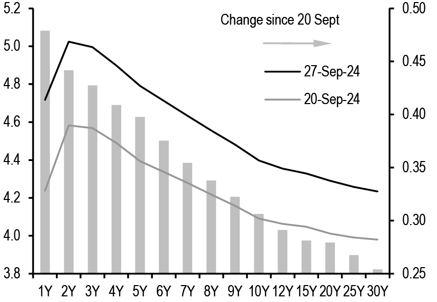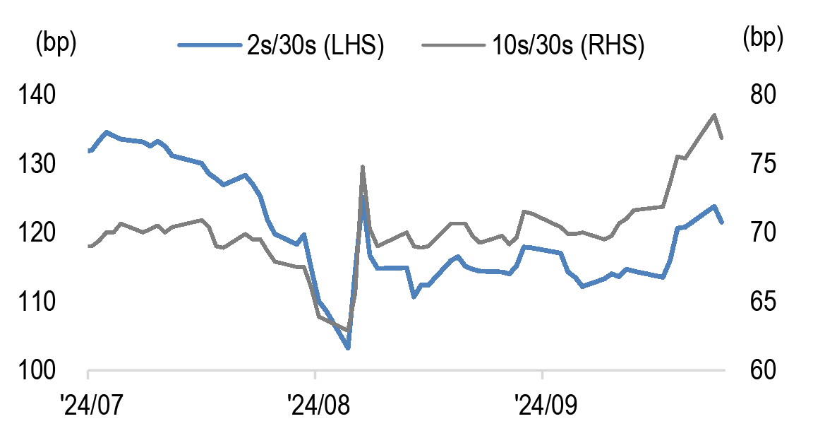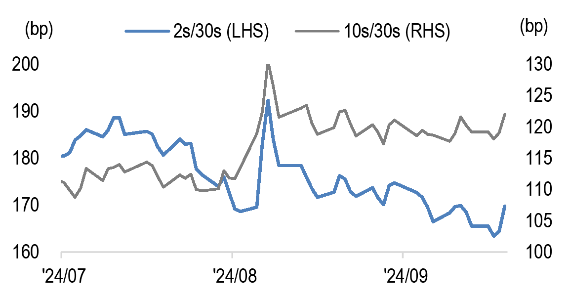 Finally, on a different note, investor focus in the Japanese markets shifted this week to the LDP leadership contest. The first round of the LDP election on Friday delivered a surprising turnaround with the victory of Ishiba over the Takaichi, who was seen to have good chances of winning. While Takaichi would favour fiscal expansion and oppose BoJ rate hikes, Ishiba is considered a relative hawk due to his support for fiscal consolidation and would not oppose the BoJ policy trajectory. Since the market had priced in a Takaichi win scenario, we expect yields to reprice higher and curves to flatten in coming days.