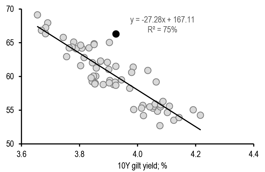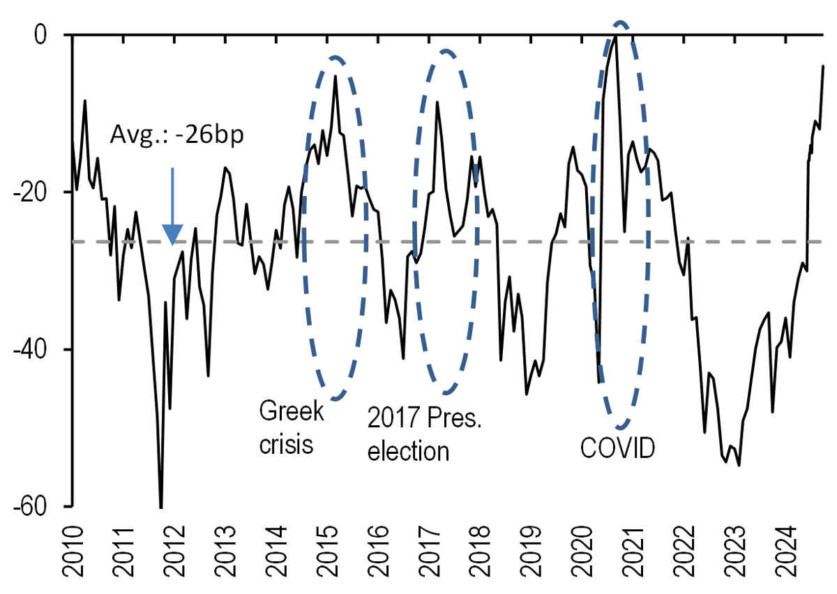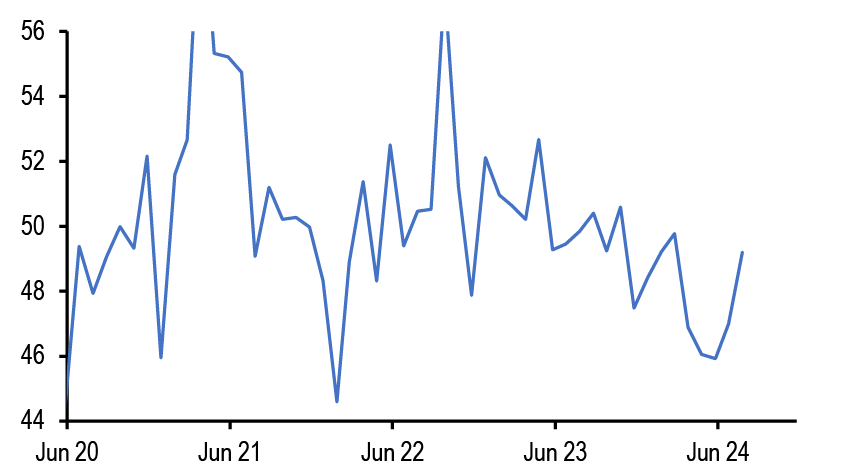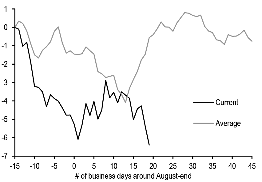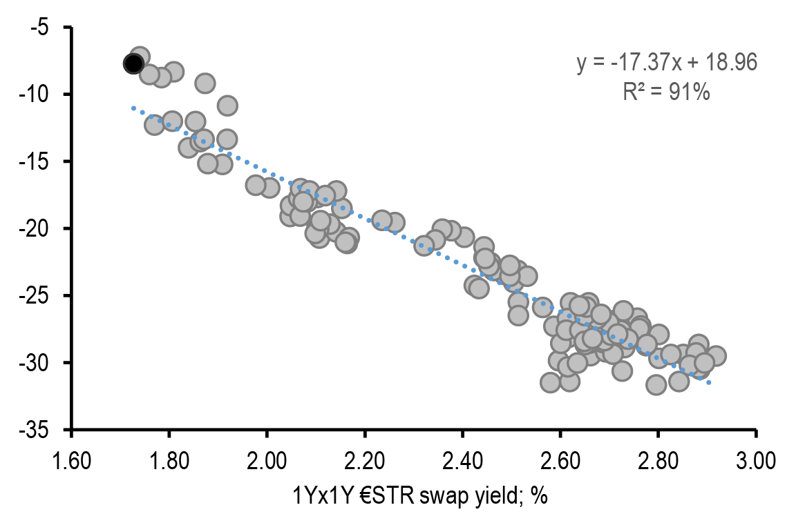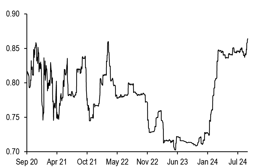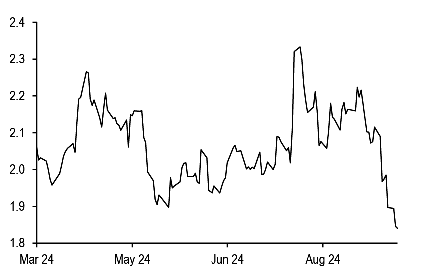 All in all, we believe that this week’s data have moved the needle and give reason to believe that the ECB will have to break away from its gradual stance given the signs of weakening on the growth side. We have thus changed our ECB call (see ECB to go meeting-by-meeting, starting in October, G. Fuzesi, 27 September) and now expect the next ECB cut at the upcoming October meeting (vs. December previously) and consecutive 25bp cuts thereafter (while we had previously penciled in back-to-back cuts only from March 2025). Concerns about services inflation are likely still there, but there is a strong case for delivering cuts a bit more quickly to help avoid a more abrupt growth slowdown and thus a disorderly disinflation process. We believe that the Governing Council could easily shift its rhetoric and present the October cut as an “insurance” cut and not pre-commit to a particular path thereafter. We believe that the ECB will reach a terminal rate of 2% in June. We note that this remains our best guess for neutral rate, but there are risks that the ECB could cut rates even below 2%, even in absence of a recession, given the possibility of inflation undershooting due to a lower r*. Risks around medium-term inflation indeed remain balanced on both sides in the Euro area more than elsewhere.