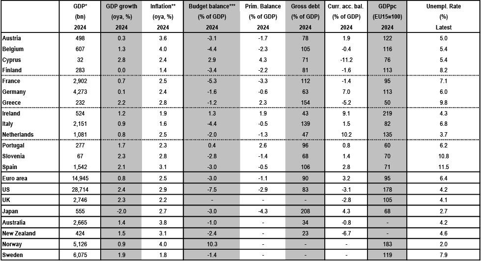 For Australia and New Zealand data: Australian Treasury, RBA, NZ Treasury, RBNZ. For Australia, budget, gross debt and nominal GDP data are for FY24
