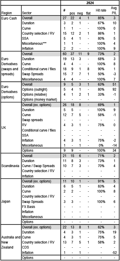 ** Avg. P/L across total # trades. Options trades are shown in bp of notional, except for money market trades which are shown in bp of yield and not included in avg P/L calculation.