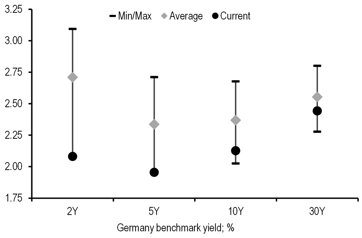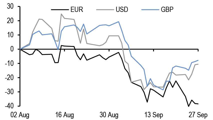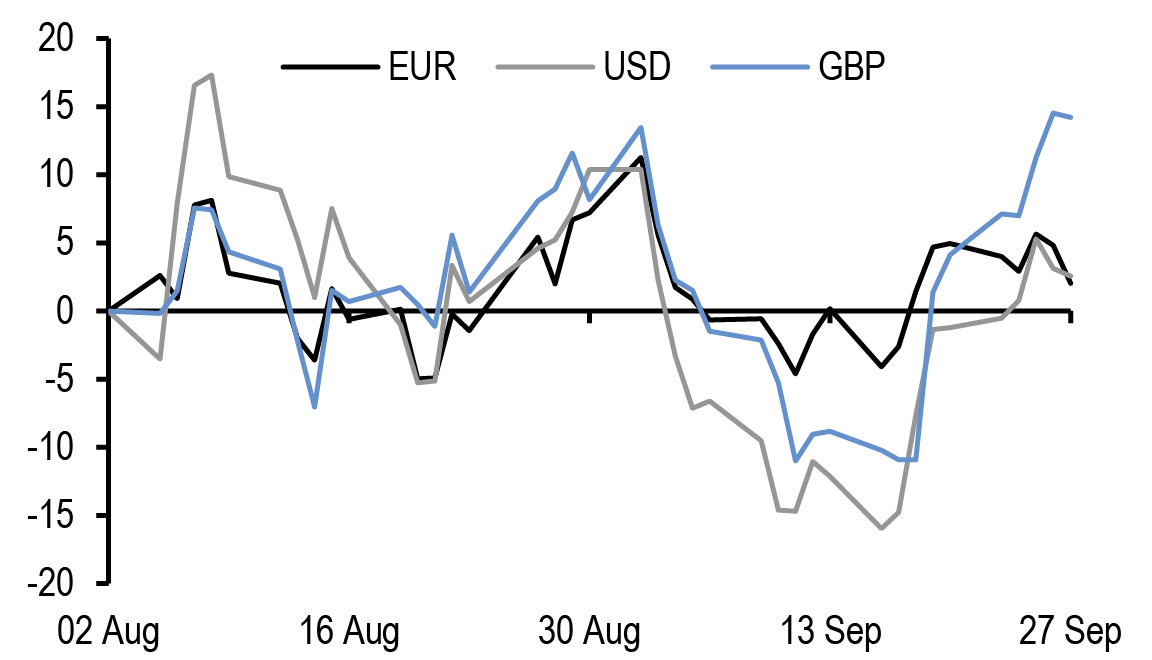Idiosyncratic macro dynamic came to the forefront of rates markets this week with a notable outperformance of EUR rates in a bull steepening move ( Figure 1), led by a short-end rally of around around 17bp. The outperformance of the Euro area was driven by a weak flash PMI for September and selective inflation data in France and Spain. UK rates twist steepened with a 5-8bp sell-off at the long-end of the curve, while in the US rates sold off modestly relative to last week.