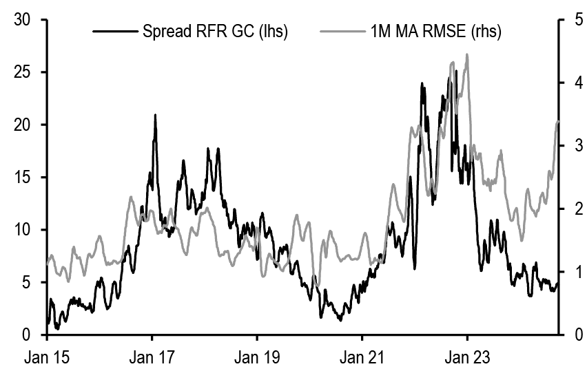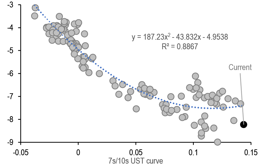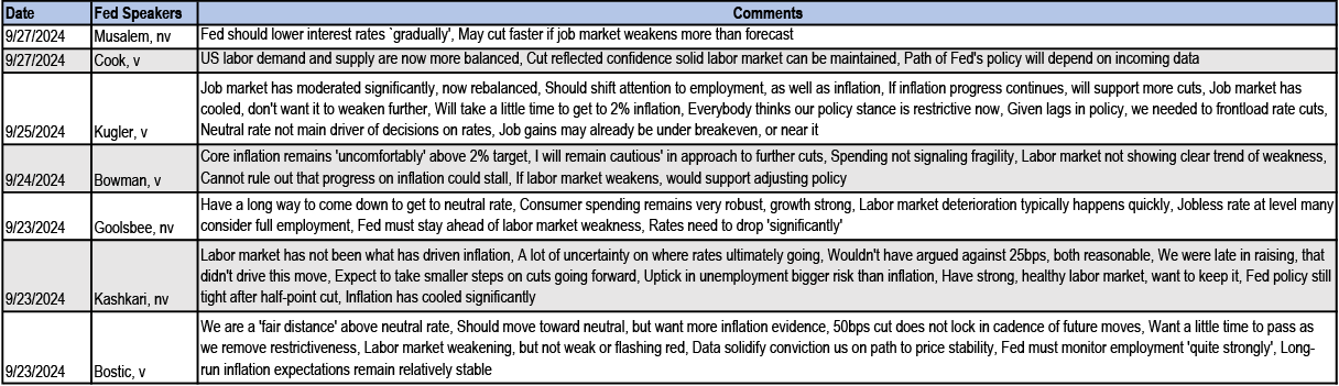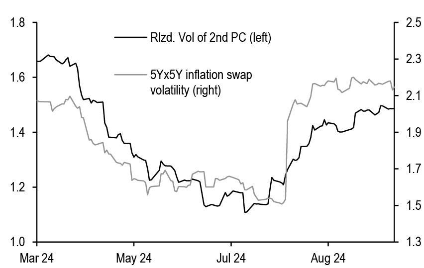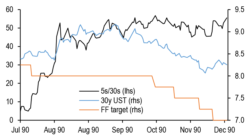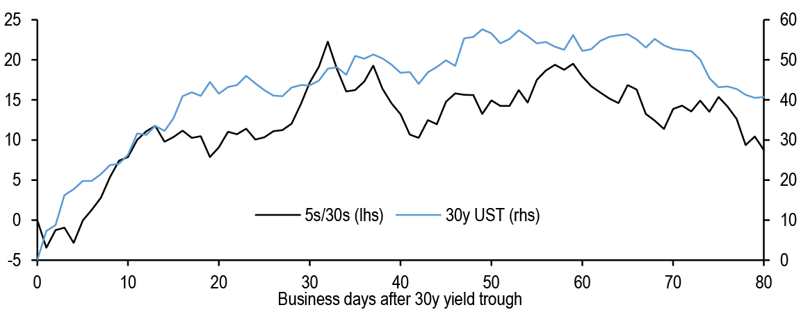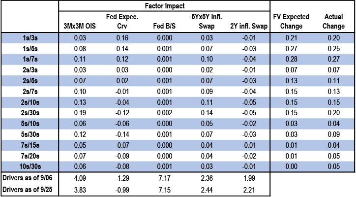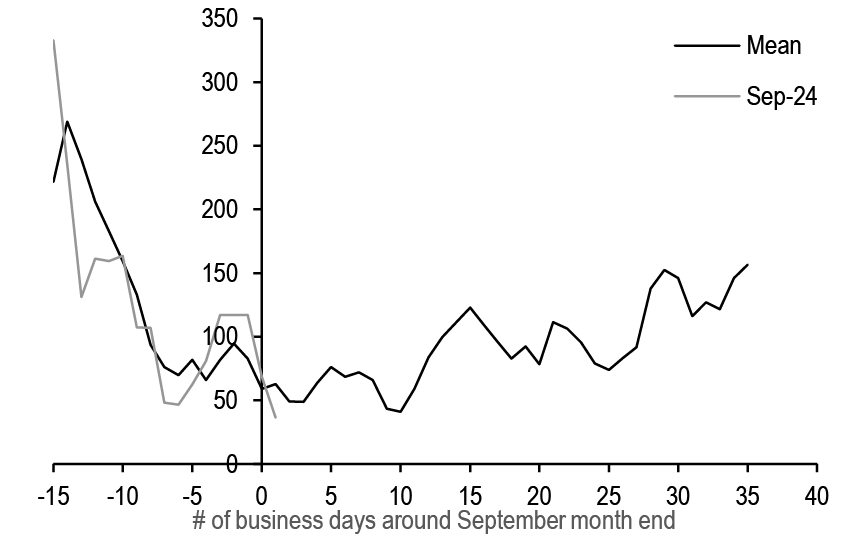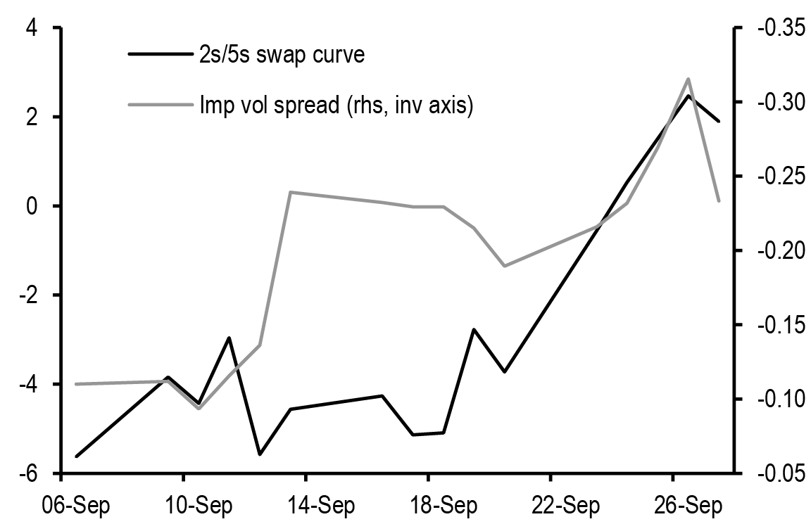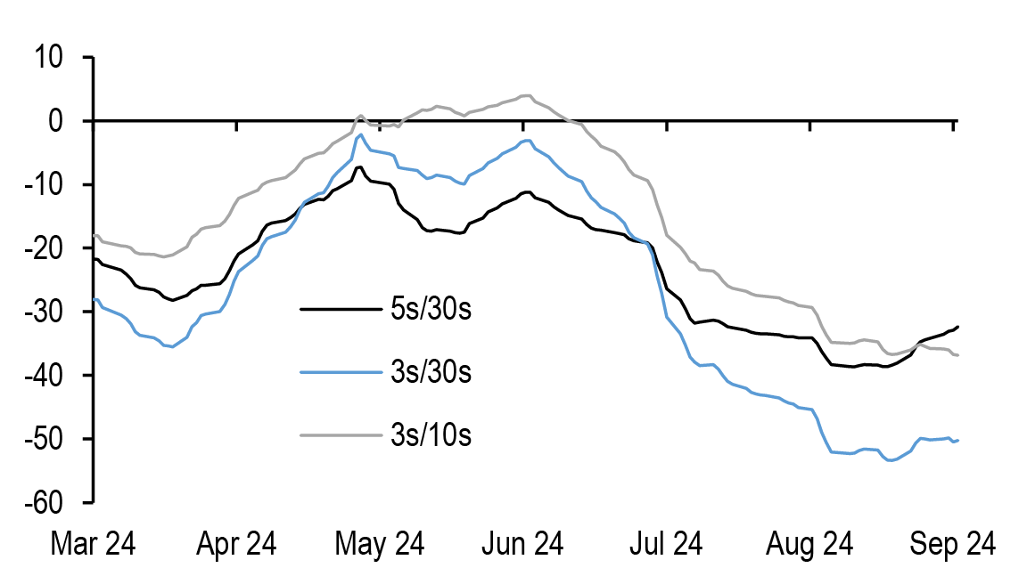 • US: If our above-consensus unemployment rate forecast come to fruition, this should bias Treasury yields lower in the near-term. We recommend expressing this bullish view with curve steepeners: curves look less steep when we also adjust for the market’s medium-term inflation expectations and the Fed’s share of the Treasury market: initiate 3s/20s steepeners. We discuss historical bear steepening periods over the last 35 years, particularly other instances when these moves took place alongside Fed easing: overall, the curve tends to consolidate after a brief bout of steepening, and long-end yields tend to stabilize or move lower as the Fed eases further. We review the tenth annual Treasury market conference, focusing on the panel discussions. T-bill supply is about to turn positive and we see $270bn of net issuance in the Oct-Nov period. Front-end bills are in the richer quartiles of their recent ranges, and the combinations of positive supply and quarter-end dynamics support some cheapening in the near term; risks are more balanced further out the T-bill curve. Stay neutral TIPS but hold energy-hedged 5s/10s BE curve steepeners. A strike among ILA dockworkers appears likely which could disrupt supply chains and push up CPI inflation around the end of the year. The bear steepening of the curve in recent weeks is partly explained by moves in long term inflation expectations, which is also helping to spur second-principal component volatility higher - underweight volatility on 10-year tails versus 30-year tails, overweight 2-year tail volatility versus 5-year tails, and overweight 5s/30s YCSO volatility versus swaptions. Stay neutral on swap spreads outright, but initiate exposure to a steeper 7s/10s maturity matched swap spread curve. Turn tactically neutral on volatility on an outright basis ahead of next week’s data.