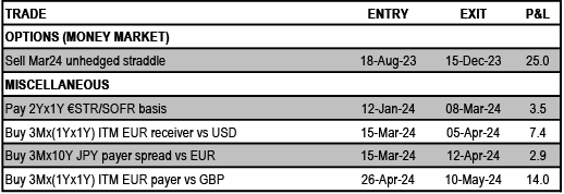 • Australia & New Zealand: Stay paid AUD 1s/2s IRS curve, and received AUD 5Yx5Y vs. US. Stay paid the Nov ’24/Feb ’25 RBNZ OIS spread ACGB Apr-2026s on ASW.