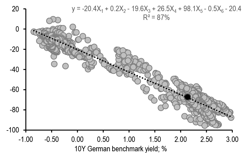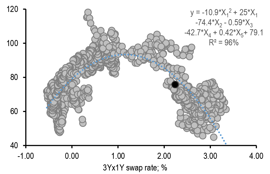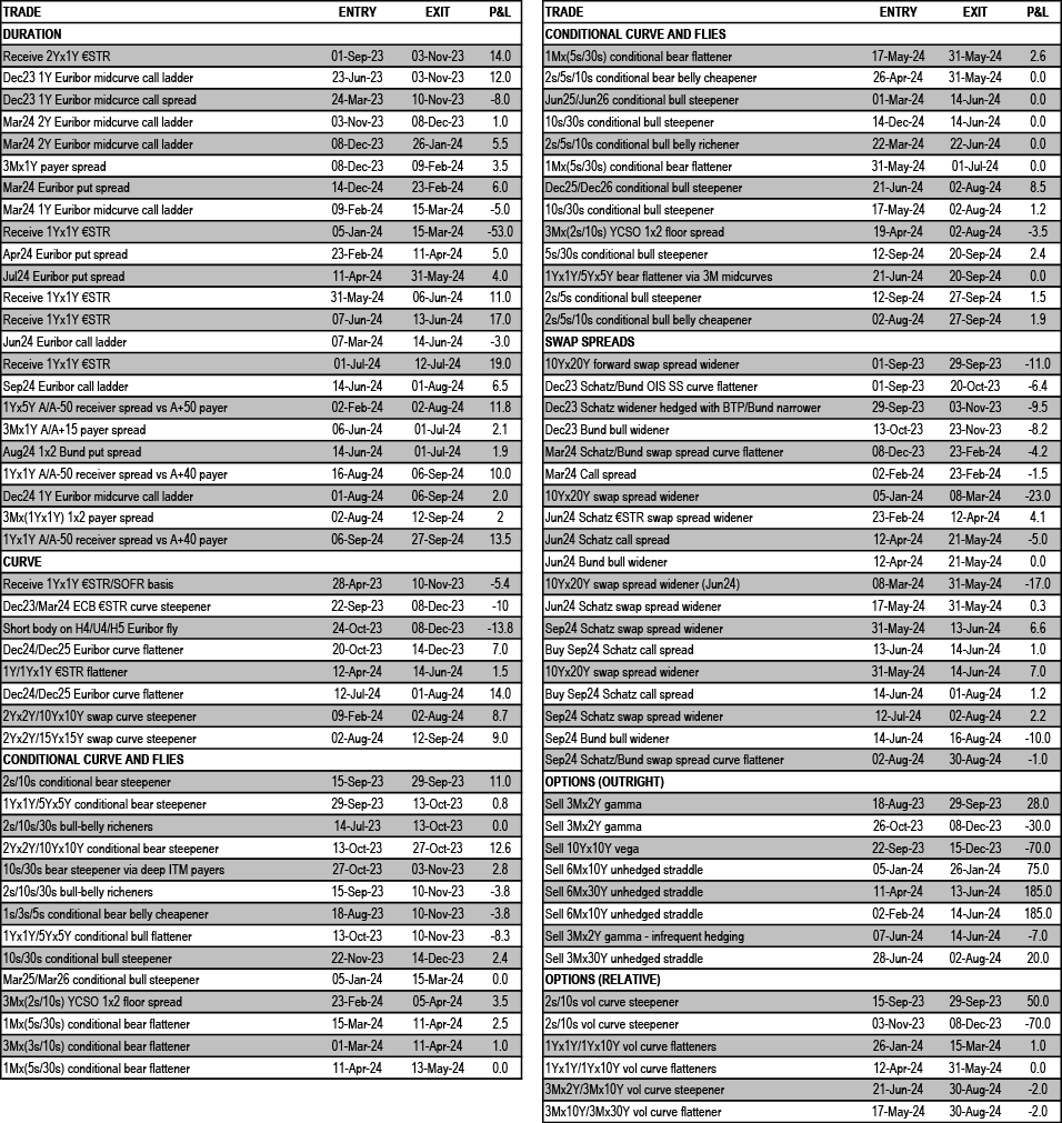 • Euro: Maintain bullish duration bias on risks of markets overshooting/pricing higher recession risks. Stay OW intra-EMU/€-SSA via OW 10Y Spain vs. Germany, OW 10Y EU vs. swap and OW 5-7Y KfW vs. Germany. Enter 5s/10s France steepener vs. Germany. Take profit on 10s/30s Italy flattener vs. Germany and long 5Y Italy CDS cash basis. Take profit and re-strike 1Yx1Y receiver spread versus OTM payer to enter at a net credit reflecting our increasing conviction of a limited back up in reds. Take profit in 2s/5s conditional bull steepener. Take profit and re-strike 2s/5s/10s conditional bull-belly cheapener via 3M receivers. Hold 10s/30s swap curve tactical flatteners hedged versus longs in reds (16% risk) on RV considerations. Keep Dec24 Schatz €STR swap spread widener as convex risk-off hedge to our long carry portfolio. Expect directionality to intra-EMU spreads to increase in a flight to quality/risk-off move potentially driven by macro or geopolitical concerns. Neutral on Bund swap spread. Initiate Dec24 Schatz/Bund €STR swap spread curve flattener. Sell 3Mx30Y gamma with infrequent delta hedging; stay short 6Mx10Y unhedged straddles.