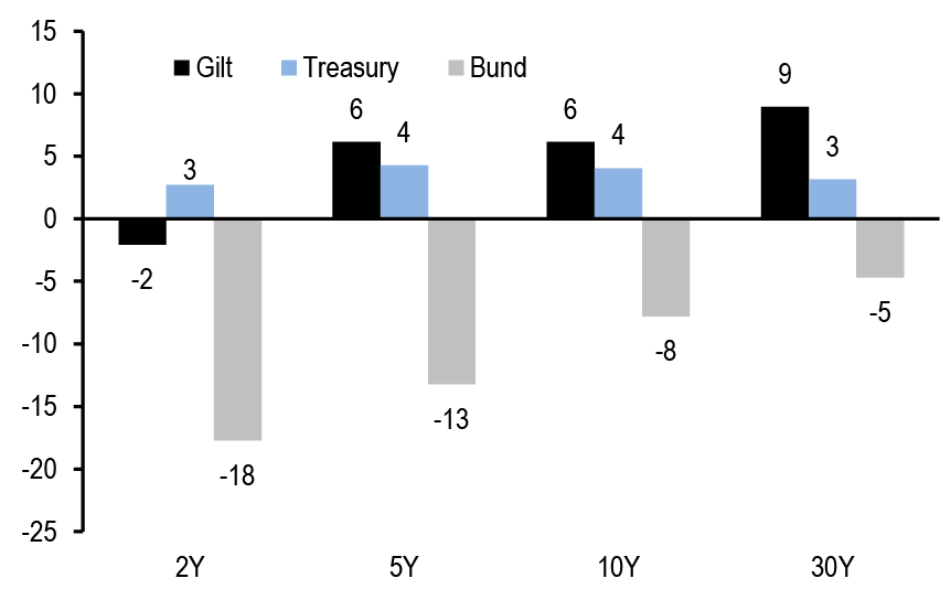 Figure 1: Idiosyncratic macro dynamic came to the forefront of rates markets this week with a notable outperformance of EUR rates in a bull steepening move