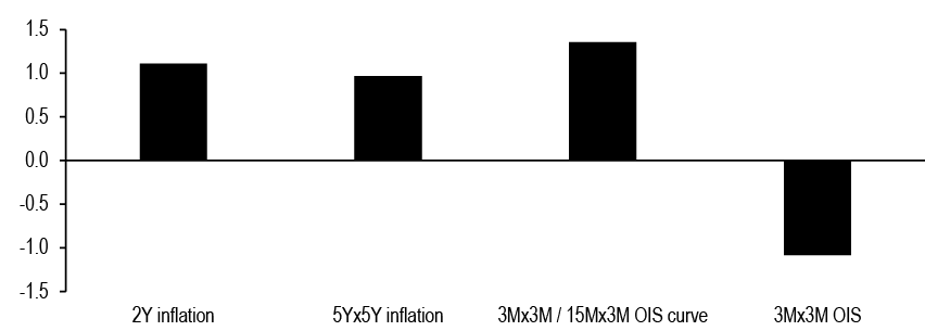 * Adjusted for the differential between policy rates and O/N OIS rates. For USD OIS, adjusted for the differential between the O/N OIS rate and the upper bound of the Fed funds target range.