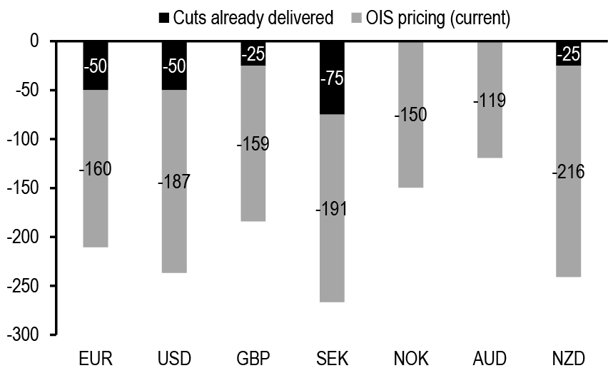 Figure 5: Relative to our call, markets are pricing in less cuts for Fed by end-2024, around the same amount for ECB and more cuts for the other central banks