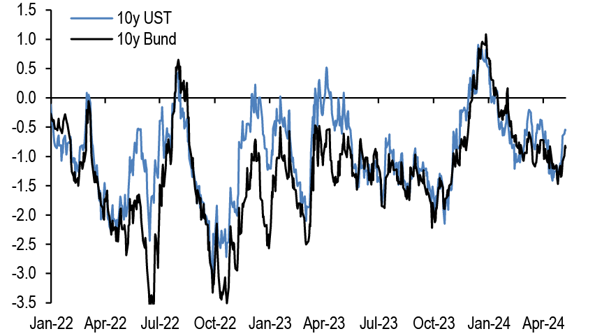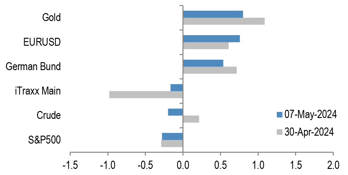 • As we have noted previously, the methodology in the IMF paper estimated that the impact from a tightening in financial conditions on GDP typically takes between one and two years to be fully felt. While this suggests that the effect of previous tightening should be fading over time, and will increasingly be offset by the loosening that has taken place in 4Q23 and the first half of 2024. While in 2H23 central banks had pointed to tighter financial conditions substituting for further rate hikes, they appear to have largely de-prioritised financial conditions as they shifted to a tailwind. But this shift may have contributed to the positive inflation surprises since the turn of the year in the US. And to the extent they have, the catch-up in euro area financial conditions could mean that while the ECB is determined to start an easing cycle in June it could be challenged over further cuts in 2H24.