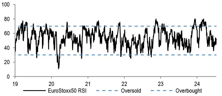 • While the S&P500 was powered again this year by Mag-7, the equal weighted index - SPW, is up a more modest 6%, having peaked in March. Likewise, SX5E has also peaked in March - top chart. Indeed, the historical spread between the performance of S&P500 and SPW is extreme. Given this, it is probable that the divergence peaks, but that could happen through winners stalling, and not through laggards rallying. Post the benign CPI print last week, SPW is bouncing again, but we fear the conditions for a sustained rally are not there, and look for the consolidation beneath the surface to continue through the summer.