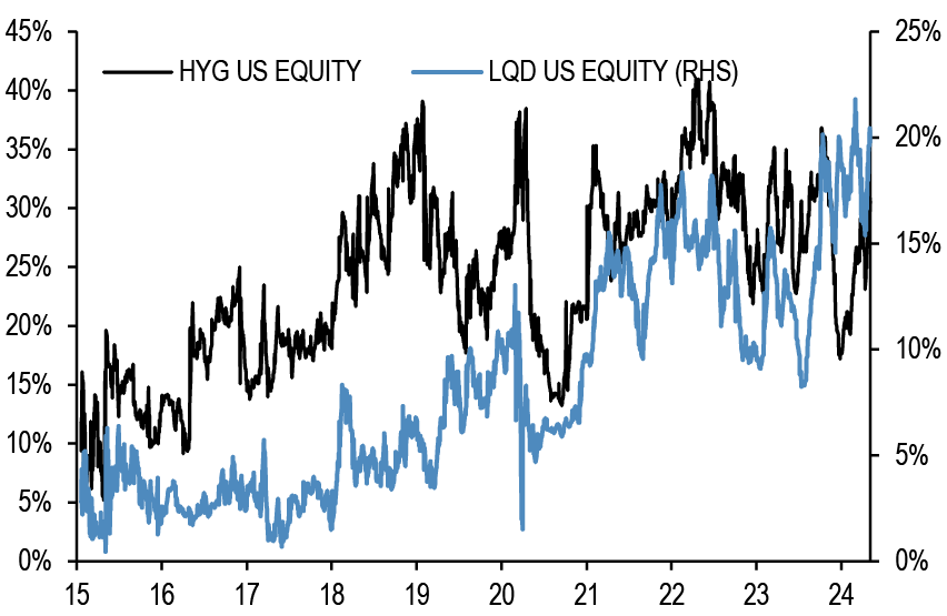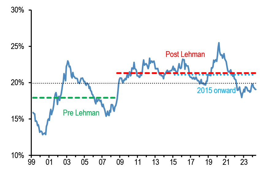 • After the release this week of the Fed’s senior loan officer survey, along with the ECB’s bank lending survey that was released a few weeks ago, financial conditions have again featured in our conversations. After the significant decline in respondents reporting a tightening in lending standards in both the US and the Euro area in the 1Q24 surveys, the latest survey suggested a modest tightening for the US in 2Q and a continued modest decline to close to zero for the euro area.