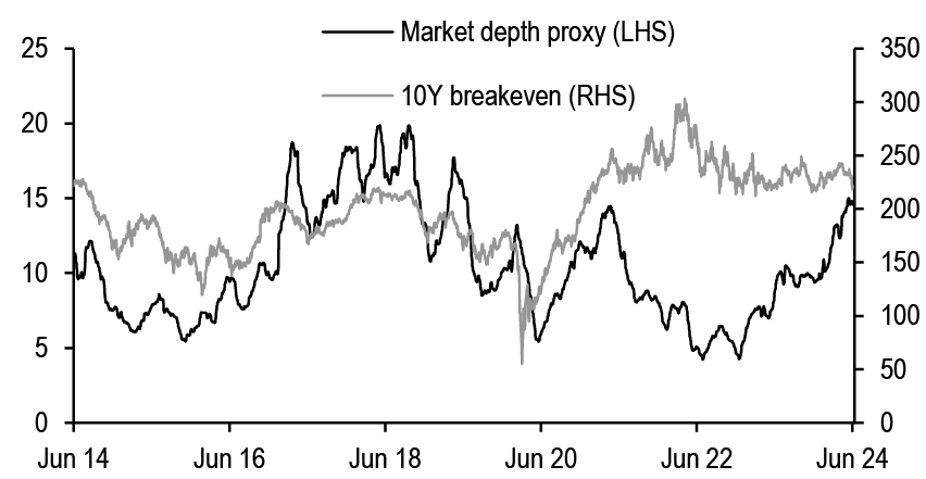 • Market depth, has improved since early 2022 but remains 50% below its decade-long average. Depth is highly sensitive to volatility, which has declined from decade-long highs but remains above pre-COVID levels. Improvement is uneven across the curve, with the front end lagging