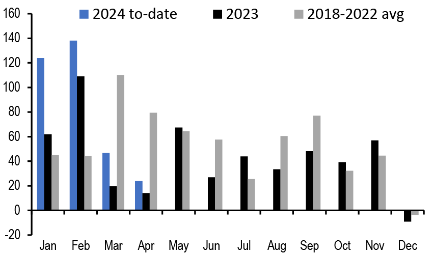 • Another source of credit creation is through net issuance of debt securities. Figure 8 shows the monthly net issuance of US HG bonds for 2024 to-date, as well as for 2023 and the average for the previous five years. The significant strength of net issuance in January and February saw 1Q24 net issuance reach around $310bn, the second strongest quarter since 2000 after 2Q20, though there appears to have been some front-loading of issuance as the pattern for the first four months is surprisingly similar to 2023 with a drop-off in the pace in March and April. Similarly, net issuance in Euro HG bonds has been similarly strong at around €109bn YTD, compared to 2023 issuance of €128bn (European Credit Weekly, May 3rd), suggesting that while loan growth has remained muted credit growth via capital market issuance has been strong.
