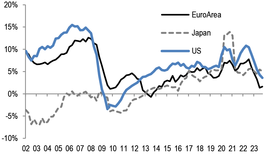 • This financial conditions indicator is depicted in Figure 2 for the US and the Euro area. It shows that financial conditions steadily improved from their peak tightening in 2H22 to a net loosening by 4Q23. Moreover, this has been a broad-based improvement as the effect of past yield rises has faded, equity returns turned from a headwind to a tailwind and lending surveys have eased back significantly from their previous peaks. Based on quarter-to-date data for 2Q24 on 12-month changes to rates, spreads, returns as well as the 2Q24 lending surveys, this positive impulse from financial conditions appears to have continued.